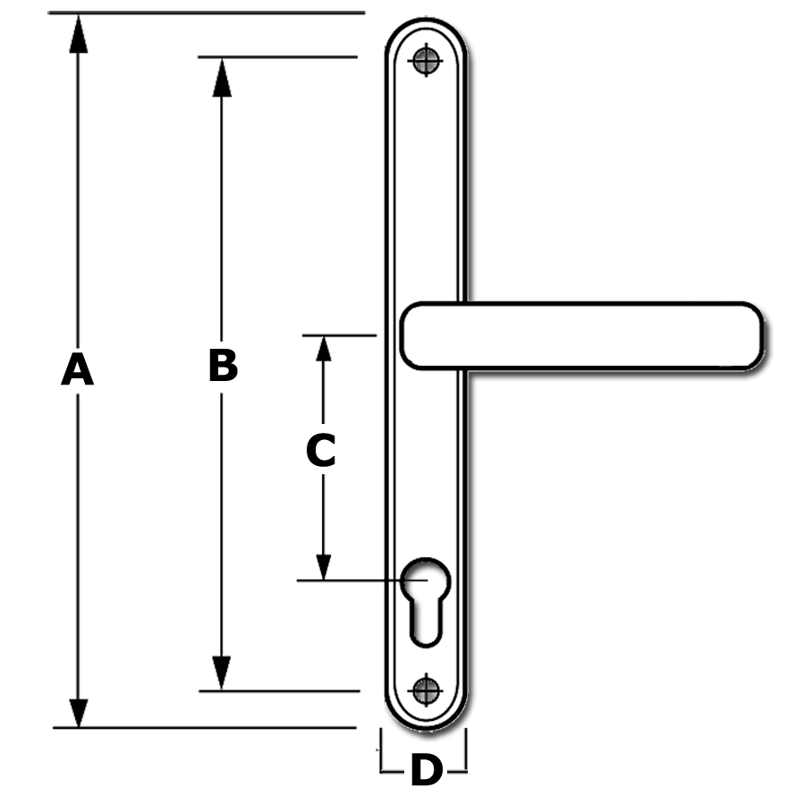 There are many shapes and styles of door furniture to suit UPVC doors fitted with multipoint locks. The selection is easy if you know the handful of measurements required including the distance between the fixing holes and the locking centers.